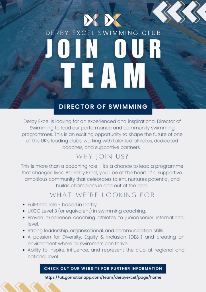 This is more than a coaching role – it’s an opportunity to lead a performance pathwaythat changes lives. At Derby Excel, we are proud of our inclusive, community-driven culture where every swimmer, regardless of background, is given the chance to succeed. If you are ready to bring your passion, expertise, and leadership to inspire the next generation of swimmers while shaping the future of our club, we would love to hear from you.